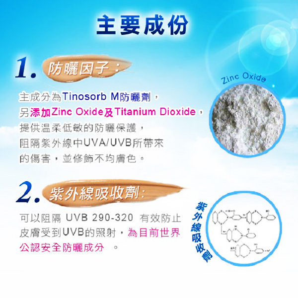 目前物理性防曬,主要成分是氧化鋅及二氧化鈦,這些物理性防曬成分其實是一些粉體,在調製過程中,將其加入產品內,透過反射、散射、或折射的方式對抗紫外線,通常物理性防曬商品質地比較厚重,較難塗抹均勻,容易有泛白的問題,但因為產品較為溫和,因此敏感肌也能安心使用。