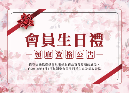 自2018/4/1起,調整「佐登妮絲會員權益」以及「會員生日禮」,以提供更完善的服務,回饋給廣大的佐登妮絲會員朋友們。