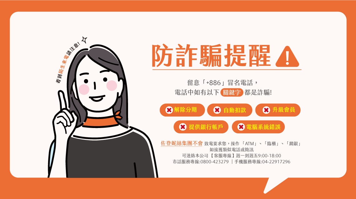 詐騙集團經常利用晚上或假日等時間進行詐騙,若您接獲此類可疑電話請無須理會,可撥打佐登妮絲客服專線或向門市店長確認,亦可撥打165警政署防詐騙專線(24小時服務)查證。