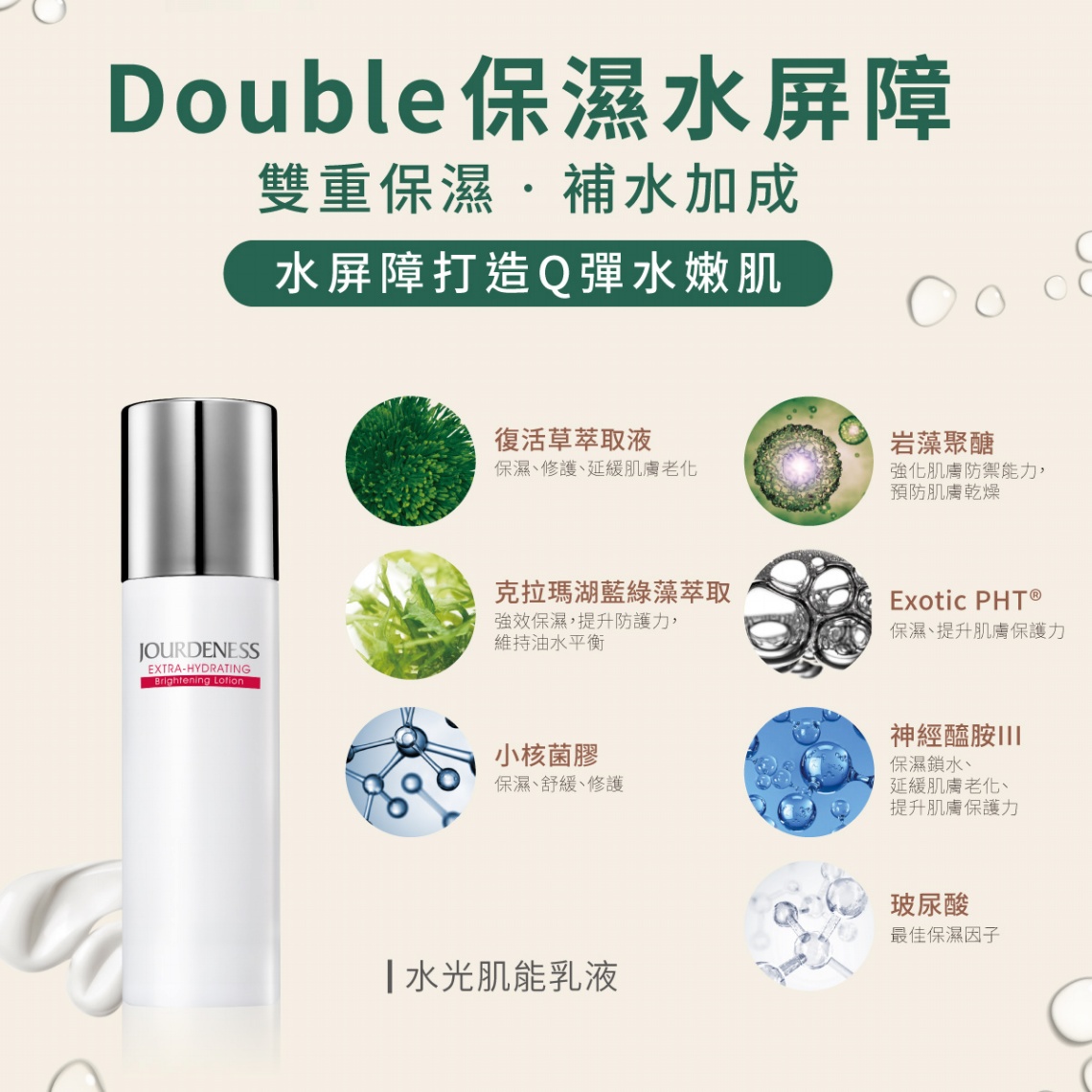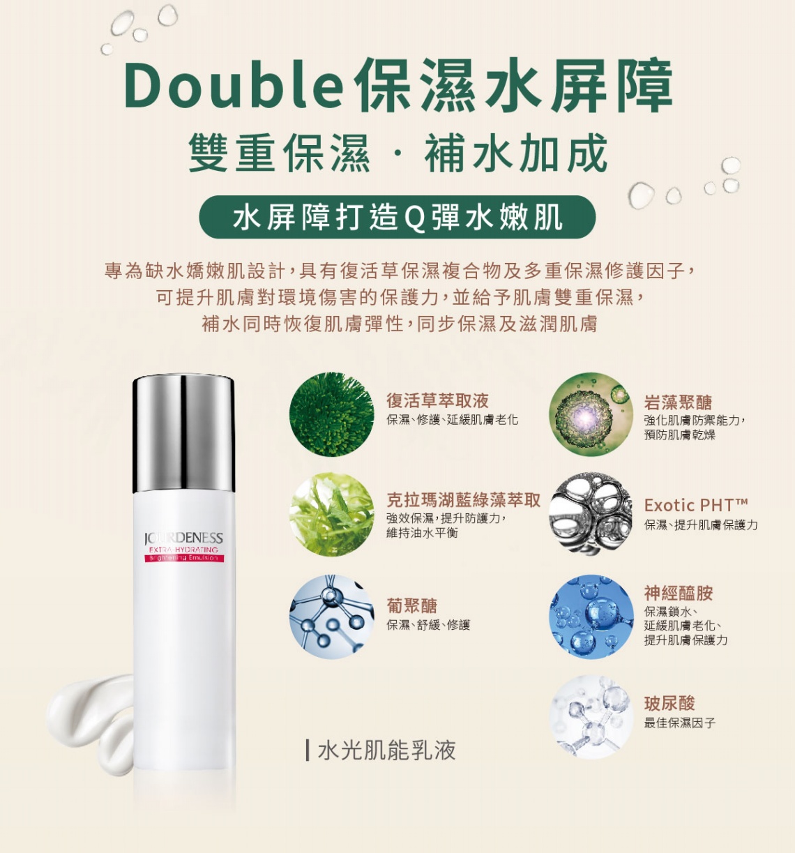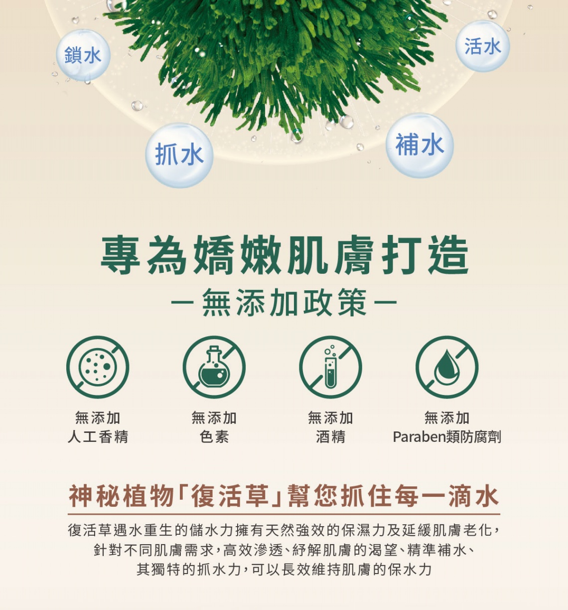 可提升肌膚對環境傷害的保護力,並給予肌膚雙重保濕,補水,同時恢復肌膚彈性,同步保濕及滋潤肌膚。 ★淬煉生命奇肌 打造肌膚蓄水力 ★恢復肌膚彈性 同步保濕及滋潤肌膚 ★Double保濕水屏障 ★雙重保濕、補水加成 ★專為嬌嫩肌膚設計.長效保濕 全天候補水