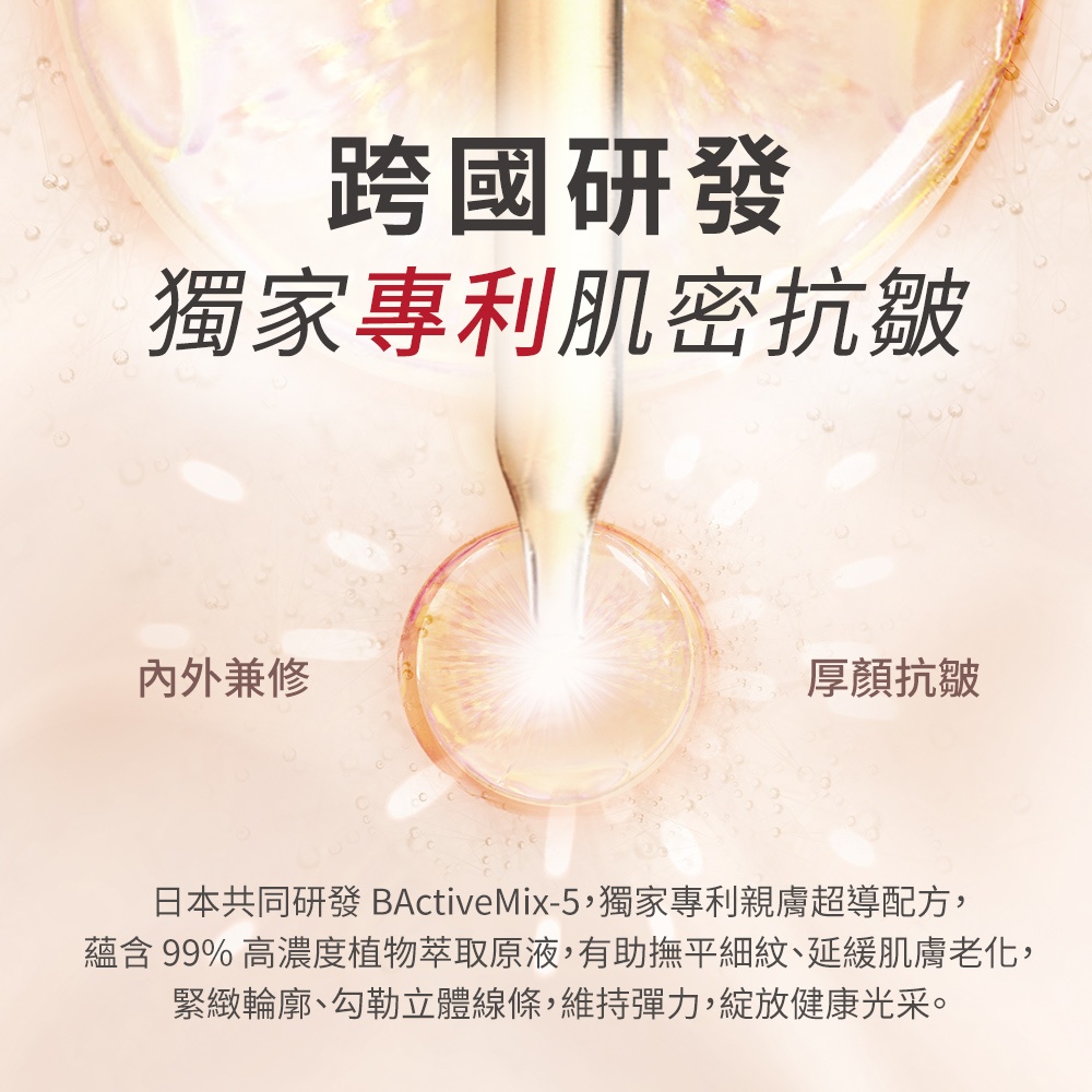 與日本共同研發的 BActiveMix-5,搭載獨家專利的親膚超導配方,將高效植萃能量直送肌底,全面針對紋路、暗沉與鬆弛問題進行精準調理。透過濃縮植物精華深度修護,可有效淡化細紋、延緩老化,使膚觸更柔順光滑,同時強化彈力,重現年輕般的緊緻光采。