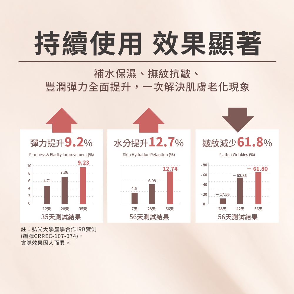彈力提升 +9.2% 水分提升 +12.7% 皺紋減少 –61.8%