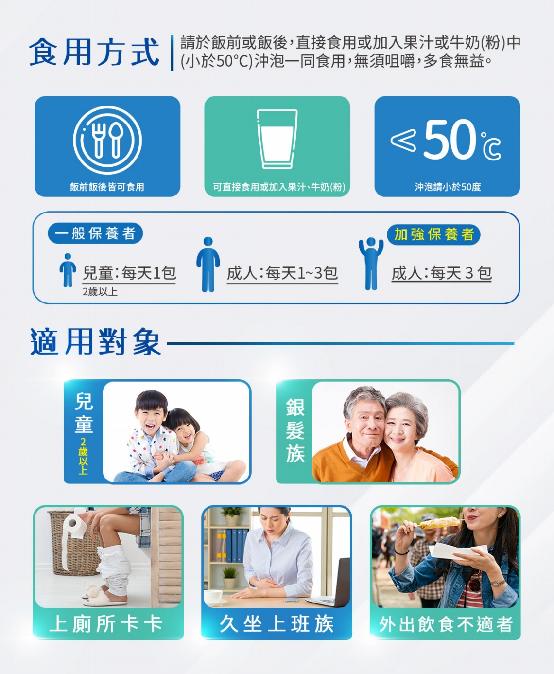 可加入果汁或牛奶(粉)中(小於50C)沖泡一同食用