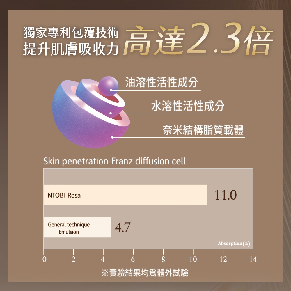 - 獨家奈米包覆專利 NTOBI Rosa ★ 2.3倍瞬效吸收力