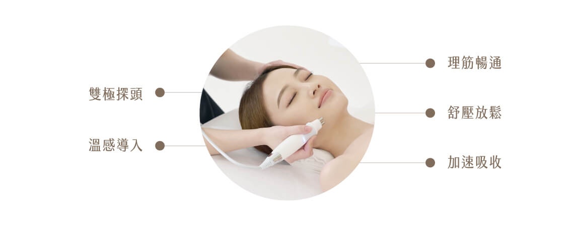 利用雙極溫感探頭,由上而下舒筋理結,釋放肌肉緊繃感,同時加速後續保養吸收。搭配玫瑰超微晶萃深入肌底,讓乾燥肌膚水感回彈、膚觸柔嫩透亮。全程溫潤舒適,特別適合容易暗沉、乾燥粗糙、保養無感的肌膚,快速養出健康亮顏狀態。